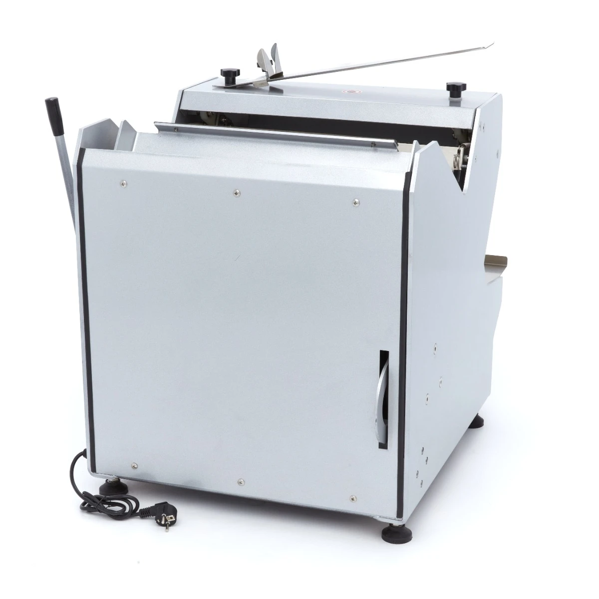 Diese Brotschneidemaschine aus beschichtetem Stahl ist ein langlebiges Gerät und eignet sich zum Schneiden verschiedener Brotsorten. Unsere Brotschneidemaschinen sind mit verschiedenen Brotstärken erhältlich. Diese Maschine hat gezackte Edelstahlklingen im Abstand von 10 mm.