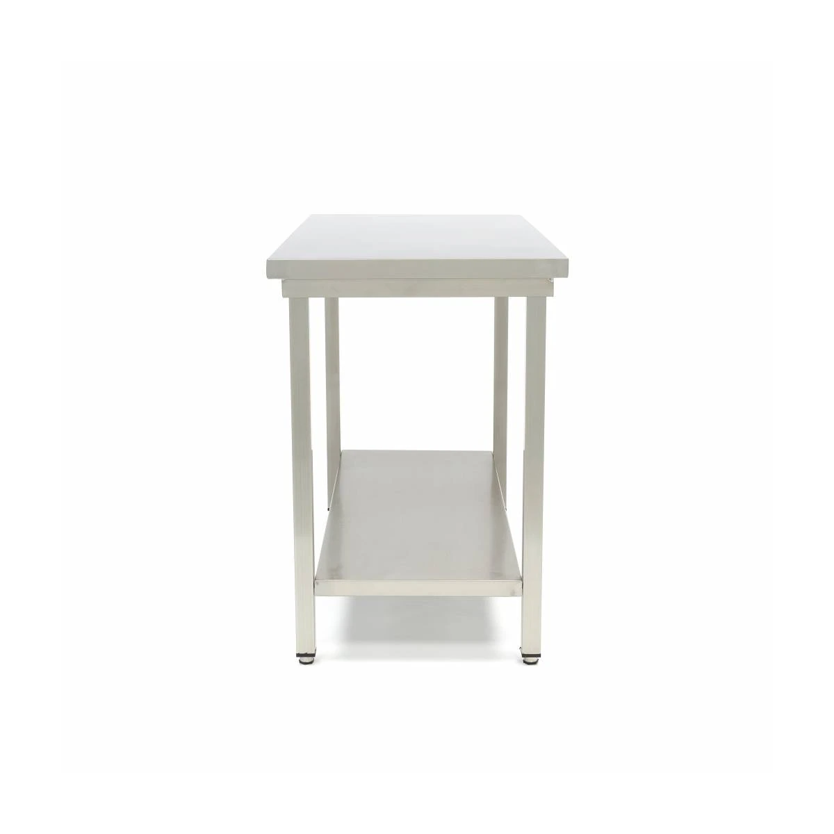 Dieser hochwertige Arbeitstisch hat eine Arbeitsplatte mit gefalteten Kanten. Die Kanten sind ebenfalls geschweißt und poliert. Ein sauber verarbeiteter Arbeitstisch ohne scharfe Kanten ist am besten für ein sicheres Arbeitsumfeld. Dieser Arbeitstisch hat keine erhöhte Kante an der Rückseite. Das Regal darunter bietet Platz für zusätzliche Ablagemöglichkeiten und ist ideal für die Unterbringung von Küchenutensilien. Es hilft, den Arbeitsbereich sauber und leer zu halten. Der Tischfuß kann nicht in der Höhe verstellt werden. Der Arbeitstisch wird flach verpackt geliefert, was bedeutet, dass er zusammengebaut werden muss. Mit dem mitgelieferten Werkzeug und der sehr einfachen Montage ist dies kein Problem. Innerhalb von 10 Minuten ist der Arbeitstisch aus rostfreiem Stahl in der Küche einsatzbereit.