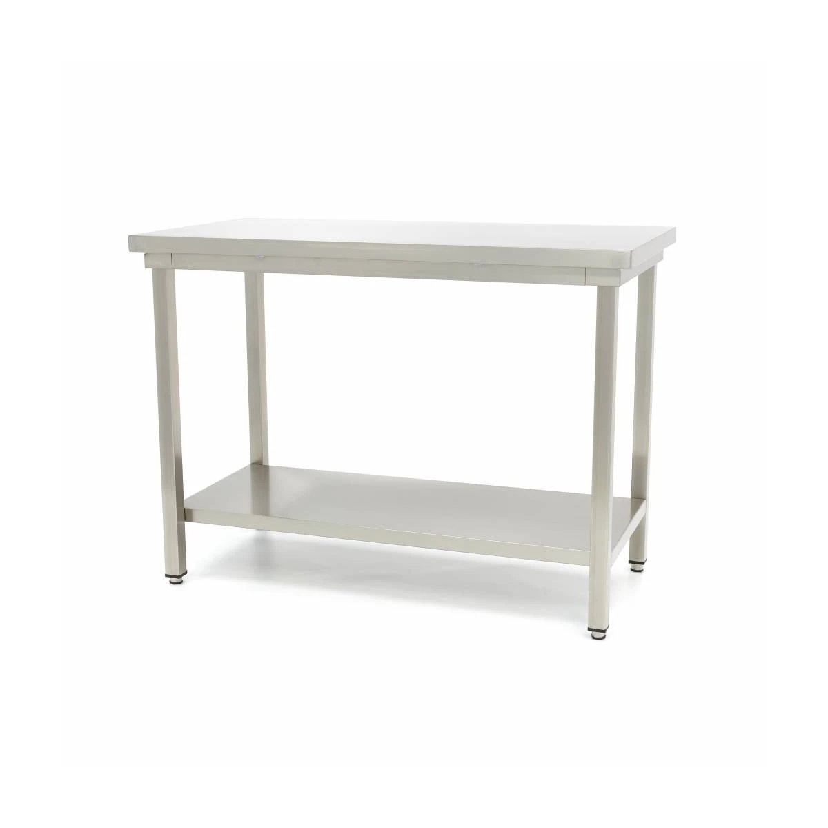 Dieser hochwertige Arbeitstisch hat eine Arbeitsplatte mit abgekanteten Kanten. Die Kanten sind ebenfalls geschweißt und poliert. Ein sauber verarbeiteter Arbeitstisch ohne scharfe Kanten ist am besten für eine sichere Arbeitsumgebung. Dieser Arbeitstisch hat keine erhöhte Kante an der Rückseite. Das Regal an der Unterseite bietet Platz für zusätzliche Ablagemöglichkeiten und ist ideal für die Unterbringung von Küchenutensilien. Es hilft, den Arbeitsbereich sauber und leer zu halten. Das Tischgestell kann nicht in der Höhe verstellt werden. Der Arbeitstisch wird flach verpackt geliefert, das heißt, er muss zusammengebaut werden. Mit dem mitgelieferten Werkzeug und der sehr einfachen Montage ist dies kein Problem. Innerhalb von 10 Minuten ist der Arbeitstisch aus rostfreiem Stahl in der Küche einsatzbereit