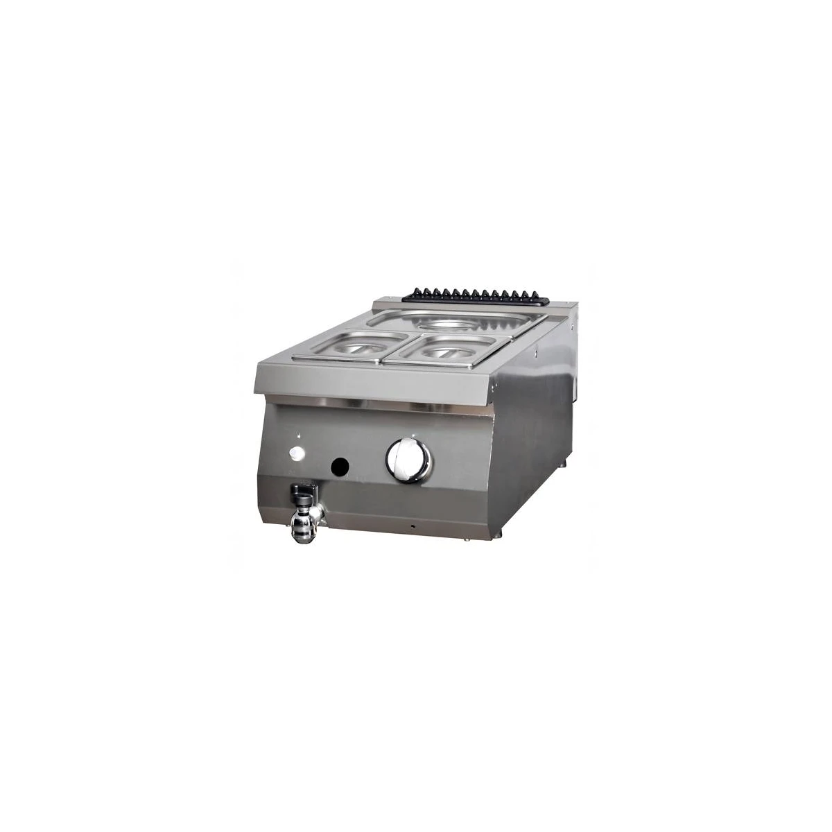 Arbeiten Sie mit Zutaten, die nicht zu heiß werden dürfen, damit sie nicht verbrennen oder sich lösen? Dann ist diese gasbetriebene Bain-Marie ideal, um zum Beispiel Schokolade zu schmelzen oder Soßen zu erhitzen. Sie bietet eine perfekte Möglichkeit, Lebensmittel zu kochen und warm zu halten. Die Bain-Marie wird manuell mit Wasser befüllt und das Monoblock-Wasserbecken ist absolut wasserdicht. Um das Wasser zu entfernen, können Sie es schnell und einfach über den Ablasshahn ablassen. Der Brenner unterhalb des Wasserbeckens ist aus Edelstahl gefertigt.