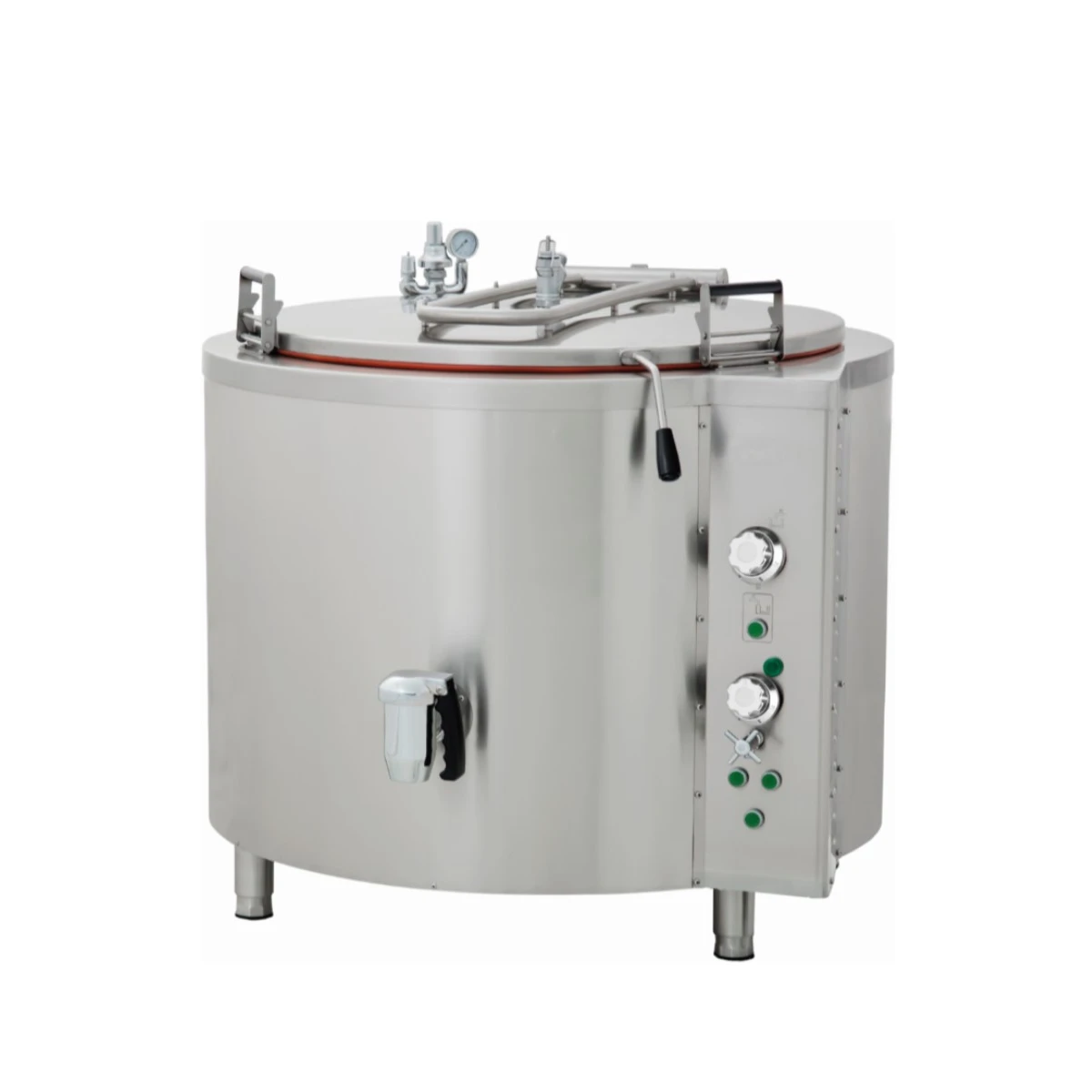 Der 325-Liter-Kochtopf ist ideal zum Kochen, Backen oder Pochieren von Speisen. Der Kochtopf hat einen doppelwandigen Deckel, der die Isolierung des Kochtopfes erhöht. Außerdem lässt sich der Deckel dank eines ausbalancierten Scharniermechanismus leicht öffnen und schließen. Dieser Kochtopf hat eine doppelte Wand, die mit Wasser gefüllt werden kann; dies ist ein indirektes Heizsystem, das eine gleichmäßige Erwärmung des Bodens und der Seitenwannen des Kochtopfs gewährleistet. Da der Kochtopf komplett aus Edelstahl gefertigt ist, lässt er sich leicht reinigen.