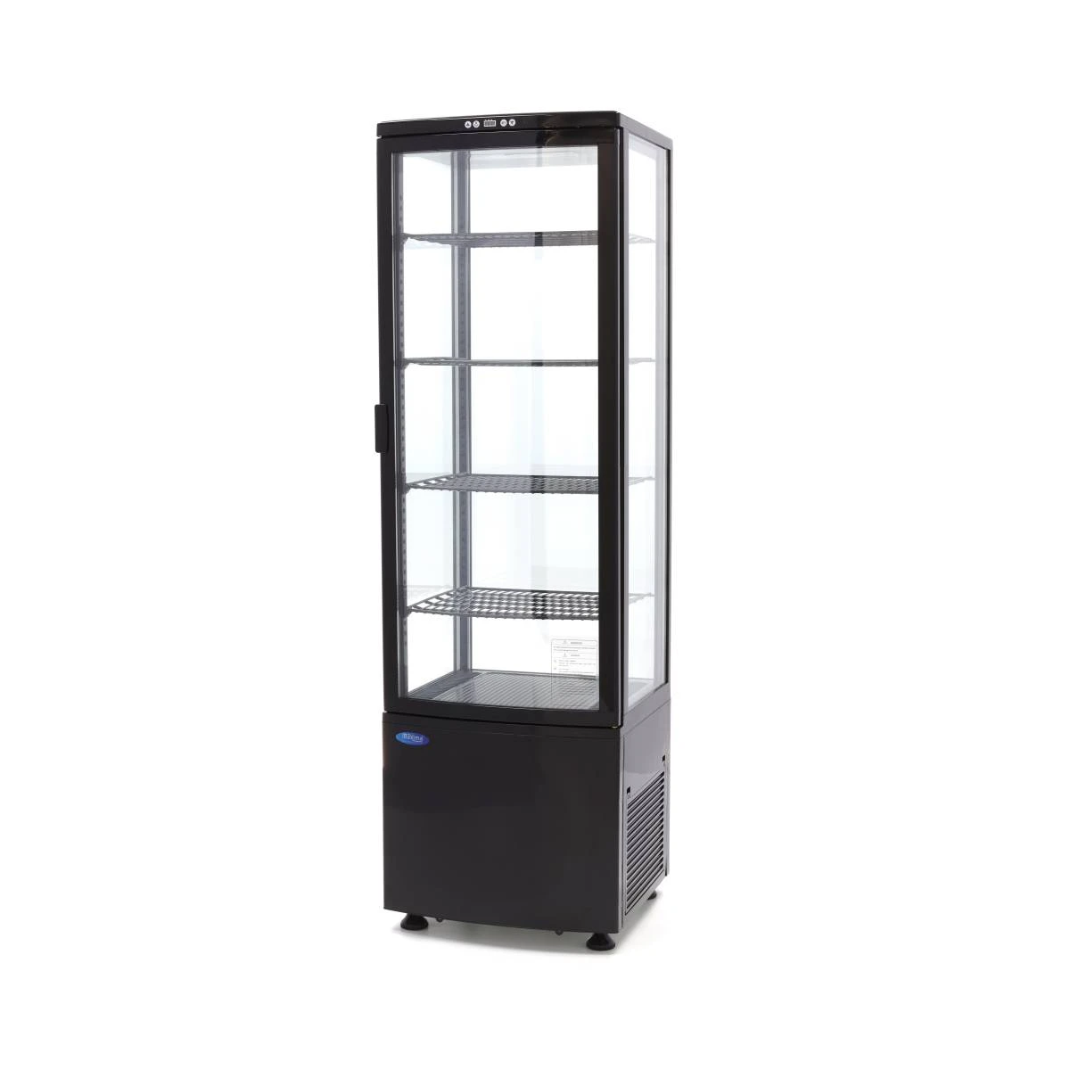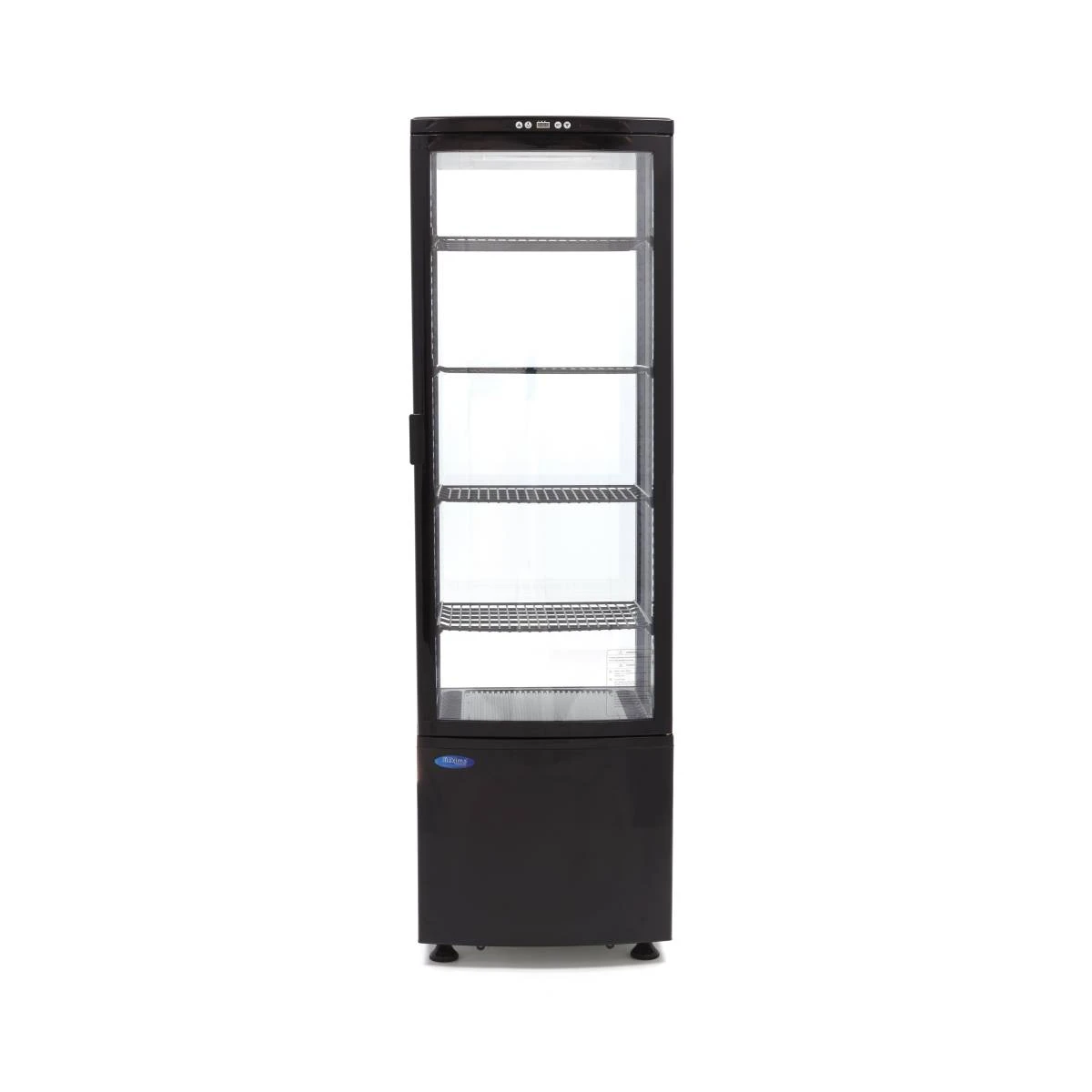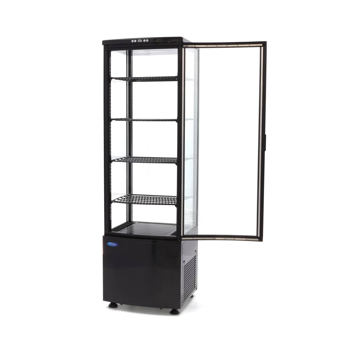 Diese hochwertige Kühlvitrine hat ein Fassungsvermögen von 235 Litern und bietet Platz für eine große Anzahl von Produkten. Die Präsentation Ihrer Produkte ist in der Gastronomie sehr wichtig. Dank der großen Fenster auf jeder Seite und der energieeffizienten LED-Innenbeleuchtung stehen die Produkte im Rampenlicht. Diese Kühlvitrine wird mit vier beschichteten Einlegeböden geliefert. Darüber hinaus ist es möglich, weitere zu bestellen, um die Produktkapazität noch weiter zu erhöhen. Mit dem eingebauten Schloss und zwei mitgelieferten Schlüsseln lässt sich die Vitrine auch abschließen.