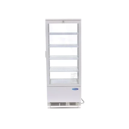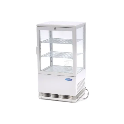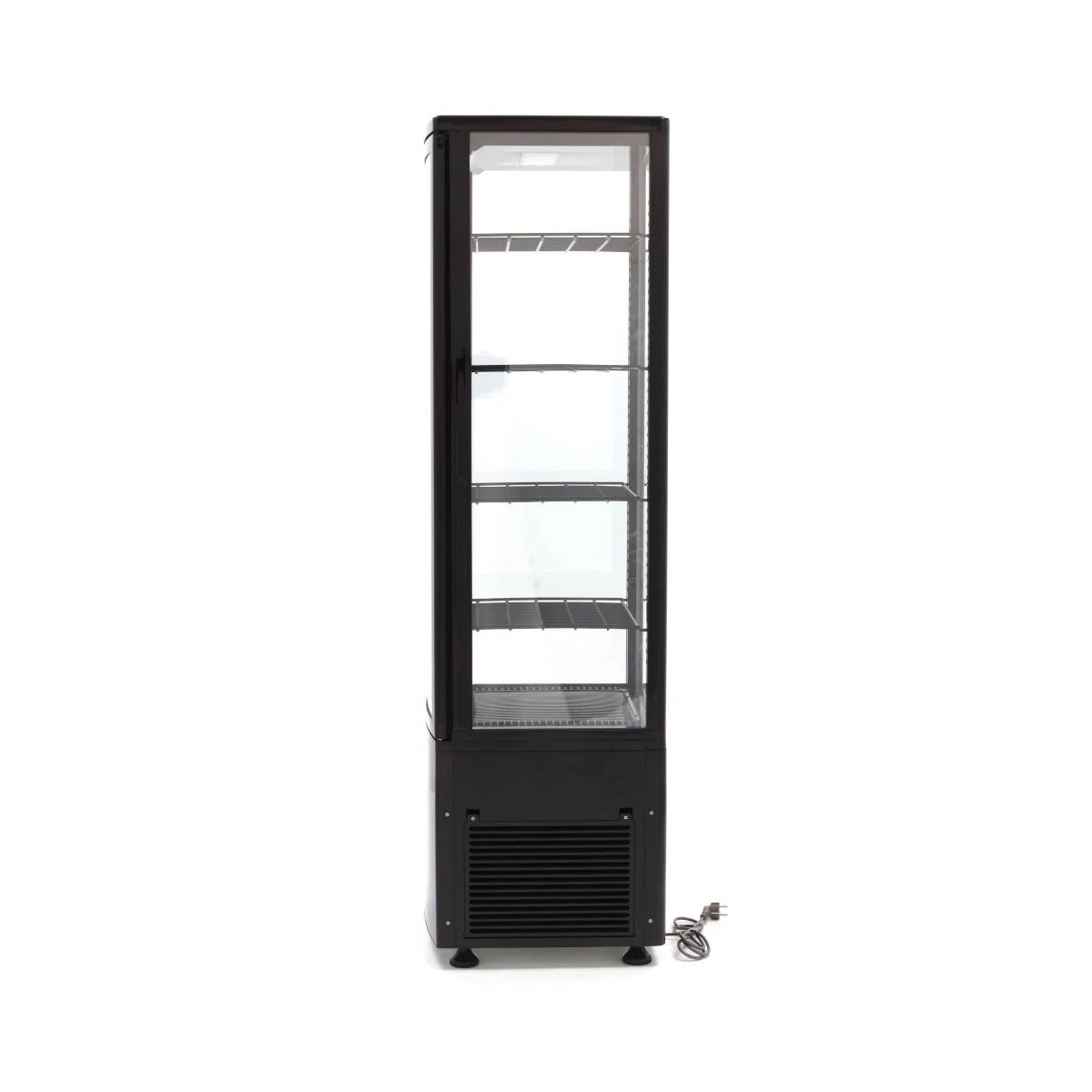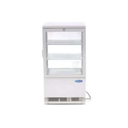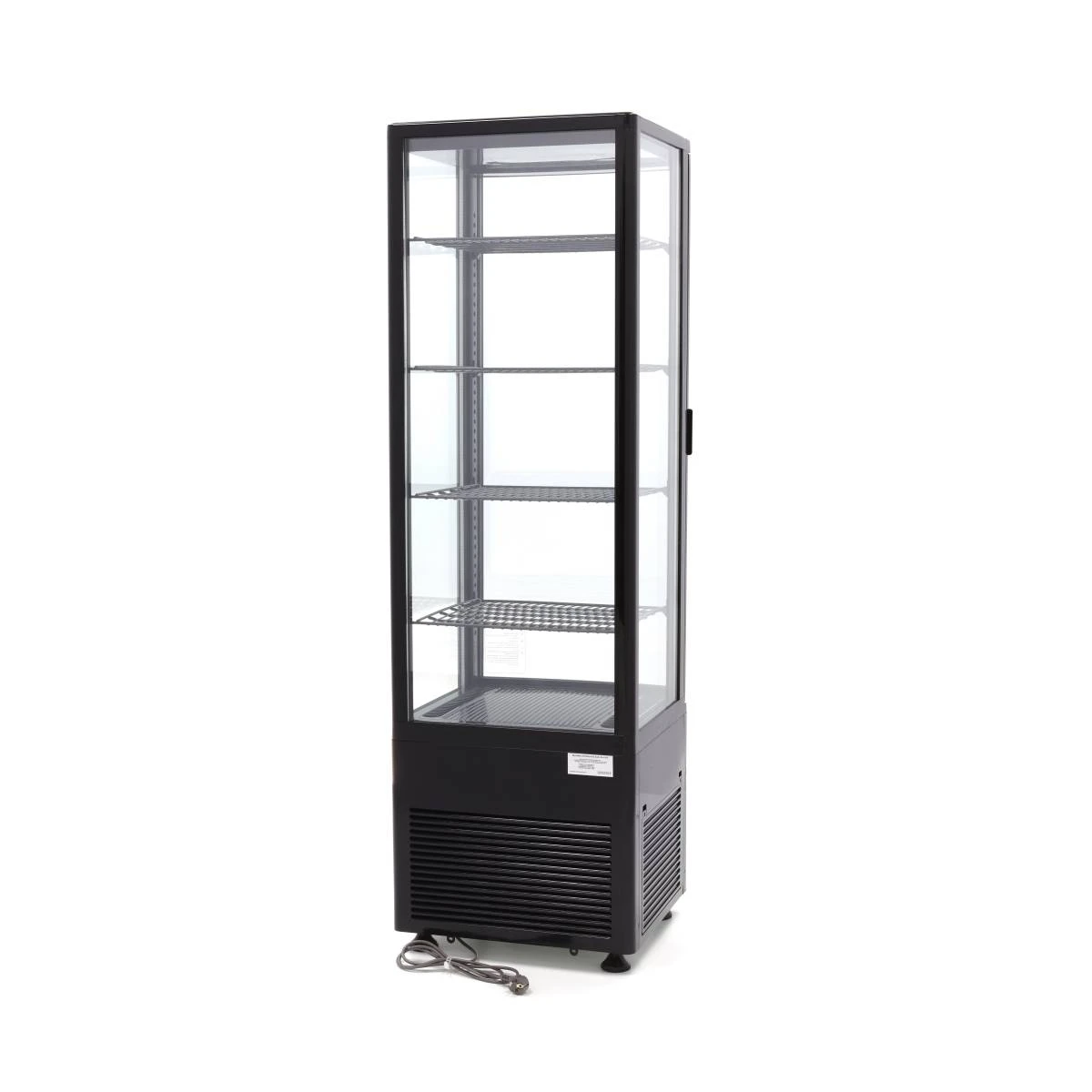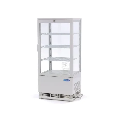 Diese hochwertige Kühlvitrine hat ein Fassungsvermögen von 235 Litern und bietet Platz für eine große Anzahl von Produkten. Die Präsentation Ihrer Produkte ist in der Gastronomie sehr wichtig. Dank der großen Fenster auf jeder Seite und der energieeffizienten LED-Innenbeleuchtung stehen die Produkte im Rampenlicht. Diese Kühlvitrine wird mit vier beschichteten Einlegeböden geliefert. Darüber hinaus ist es möglich, weitere zu bestellen, um die Produktkapazität noch weiter zu erhöhen. Mit dem eingebauten Schloss und zwei mitgelieferten Schlüsseln lässt sich die Vitrine auch abschließen.