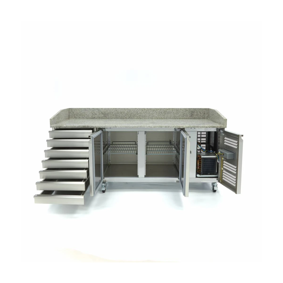 Gastro Pizzakühltisch – 202 cm – 2 Türen – Passt 5 x 1/6 GN – 7 Schubladen