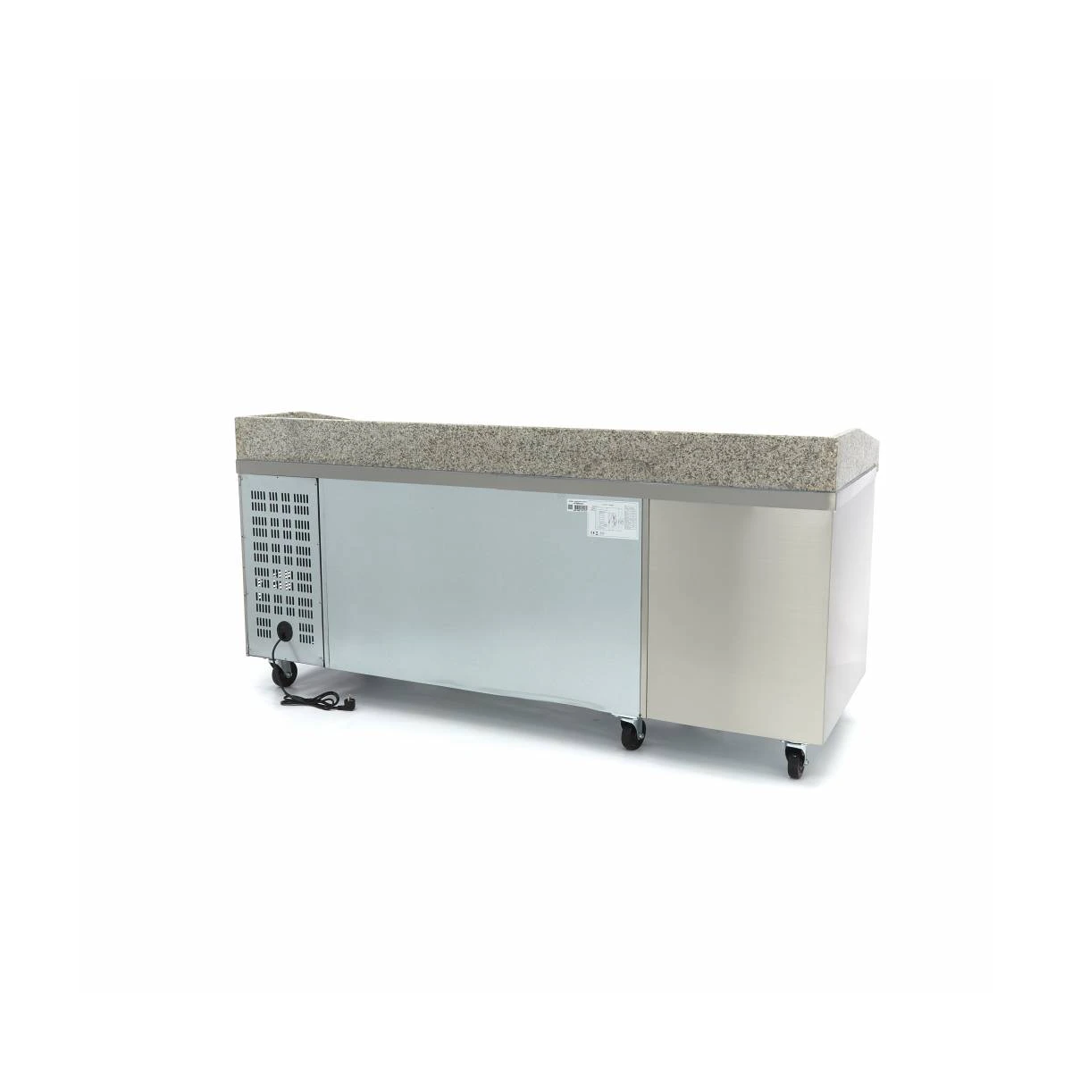 Wenn Sie täglich frische Pizzen mit den leckersten Belägen zubereiten, dann ist diese schöne, gekühlte Vorbereitungsstation unverzichtbar für Ihre Küche. Die große Granitplatte dieses Pizzakühlschranks sorgt dafür, dass der Teig nicht kleben bleibt und sofort ausgerollt und verwendet werden kann. Zur Vervollständigung des Pizzakühlschranks kann eine separate, oben angebrachte Kühlvitrine bestellt werden, so dass Sie auch alle Beläge für Ihre Pizza zur Hand haben. Dieses Premium-Küchengerät wird auch mit Edelstahlhalterungen für die GN-Behälter geliefert, obwohl die Behälter und Deckel selbst nicht im Lieferumfang enthalten sind. Diese können separat über den Webshop bestellt werden. Der Wagen ist mit Rädern und einer Bremse ausgestattet, um ihn leicht bewegen zu können.