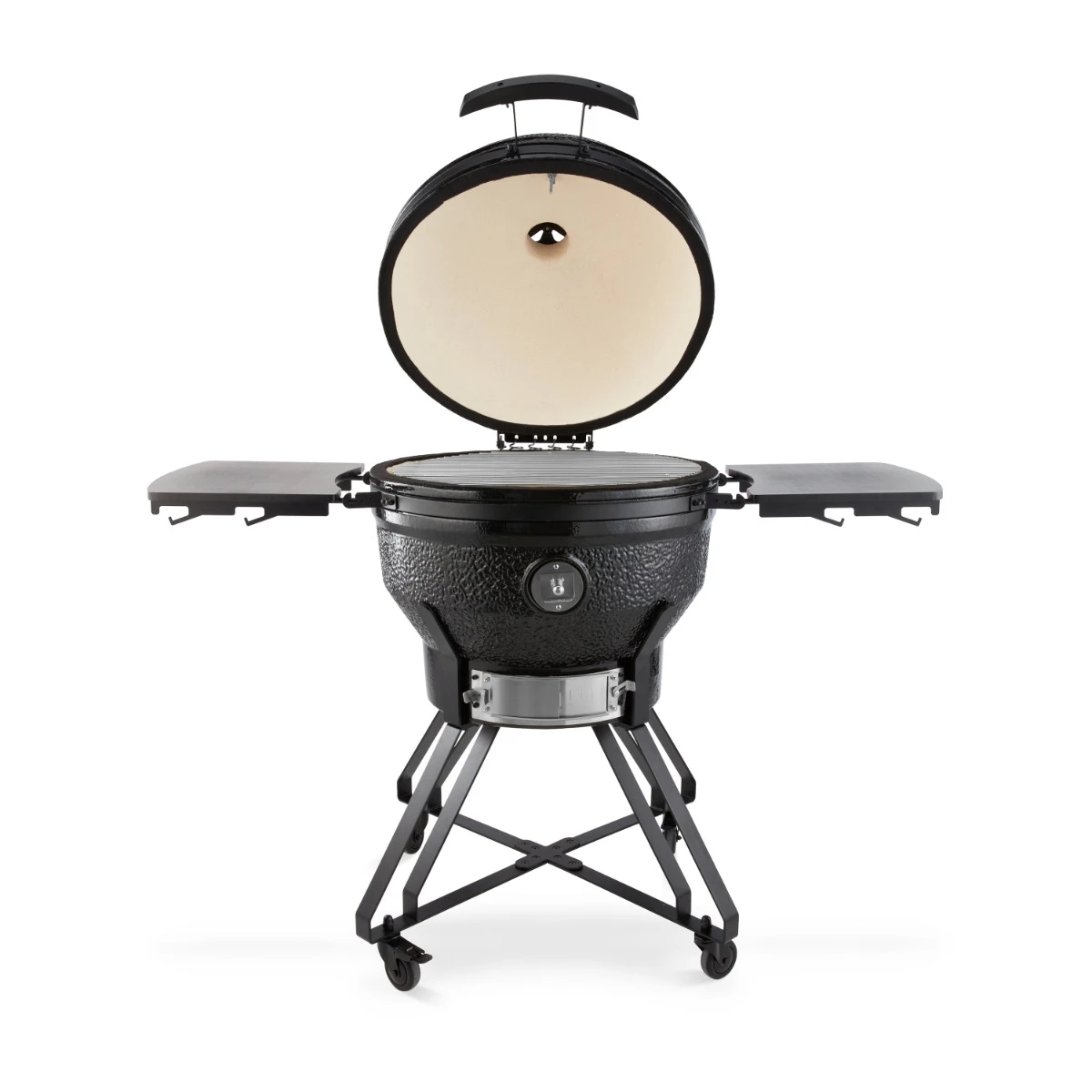 Die verstellbare Luftzufuhr am Boden und der Luftauslass im Deckel sorgen für eine optimale Luftzirkulation, mit der Sie die Temperatur Ihrer Speisen regulieren können. Auch die verstellbaren Grillplatten sind von Vorteil, da sie es Ihnen ermöglichen, Ihre Speisen in der idealen Höhe über dem Feuer zu platzieren. Die Wand und die Feuerschale sind aus Keramik und sorgen dafür, dass der Kamado nicht durch hohe Temperaturen oder Temperaturunterschiede beeinträchtigt wird.