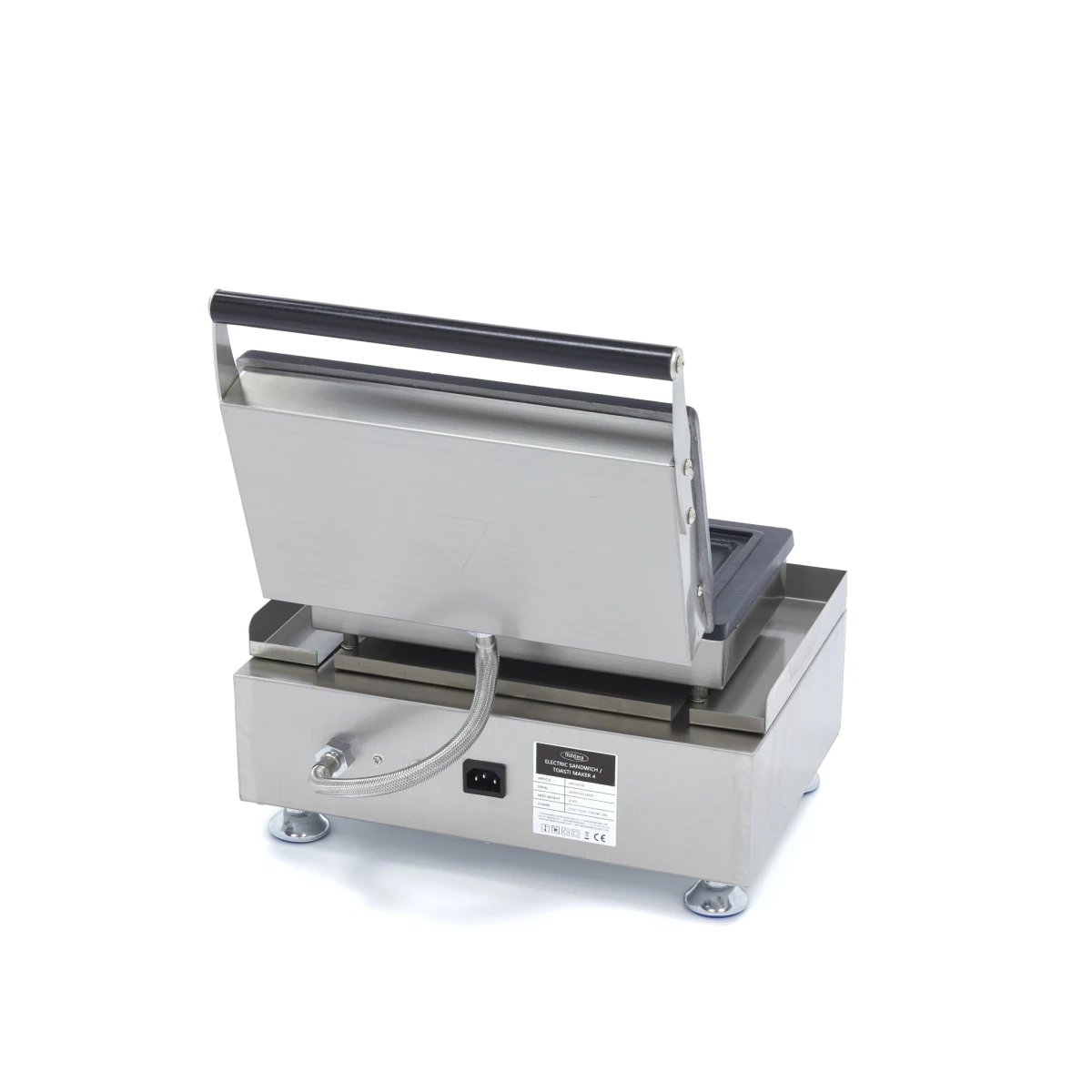 Möchten Sie Ihren Kunden schnell getoastete Sandwiches servieren? Dann verwenden Sie diesen professionellen Toast-Sandwich-Maker, der sowohl in Großküchen als auch zu Hause verwendet werden kann. Sie können zwei gegrillte Sandwiches oder Paninis auf einmal zubereiten. Die Antihaftbeschichtung der Aluminium-Backbleche sorgt dafür, dass Käse, Schinken oder andere Zutaten nicht an den Platten kleben bleiben, wenn sie entnommen werden können. Außerdem sorgt sie für eine hervorragende Wärmeleitung, so dass die Sandwiches gleichzeitig fertig sind. Dank seiner kompakten Größe ist dieser Sandwich-Toaster ideal für den Einsatz in Cafés und Restaurants