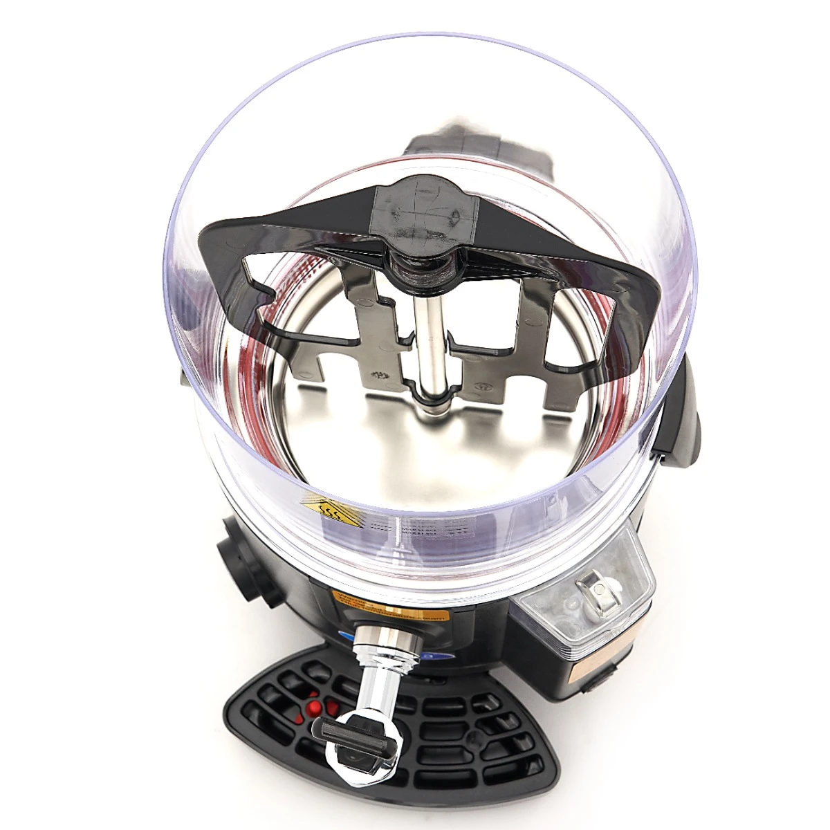 Mit diesem schwarzen Schokoladenspender können Sie problemlos 5 Liter heiße Schokolade ausschenken. Außerdem verfügt er über ein Bain-Marie-Heizsystem, das dafür sorgt, dass die Schokoladenmilch langsam erhitzt wird und nicht anbrennt. Der Rührmechanismus mit kontinuierlicher Rotation verhindert das Verklumpen und Verstopfen des Ablasshahns.