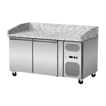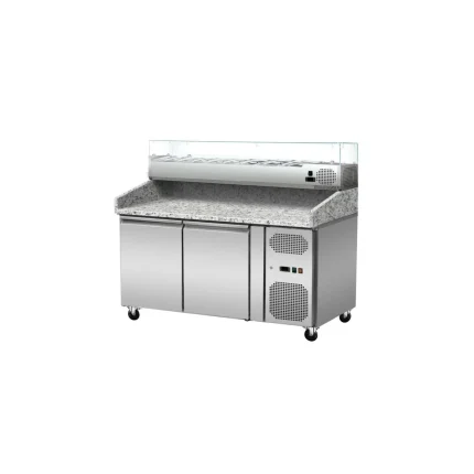 Pizza Kühltisch, Granit rosa-grau, 2 Türen, 151 x 80 Kühlaufsatz GN1/4 mit Glas