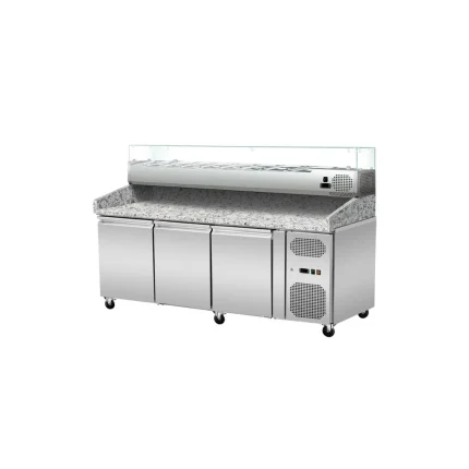 Pizza Kühltisch, Granit rosa-grau, 3 Türen, 203 x 80 Kühlaufsatz GN1/4 mit Glas