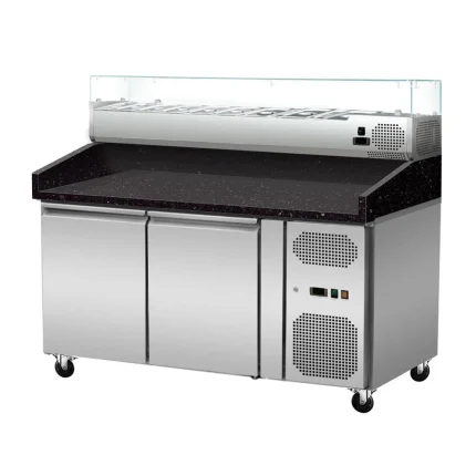 Pizza Kühltisch, Granit Star Galaxy schwarz, 2 Türen, 151 x 80 Kühlaufsatz GN1/3 mit Glas