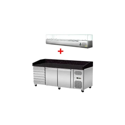 Pizza Kühltisch, Granit Star Galaxy schwarz, 2 Türen 7 ungek. Schubladen, 203 x 80 Kühlaufsatz GN1/4 mit Glas