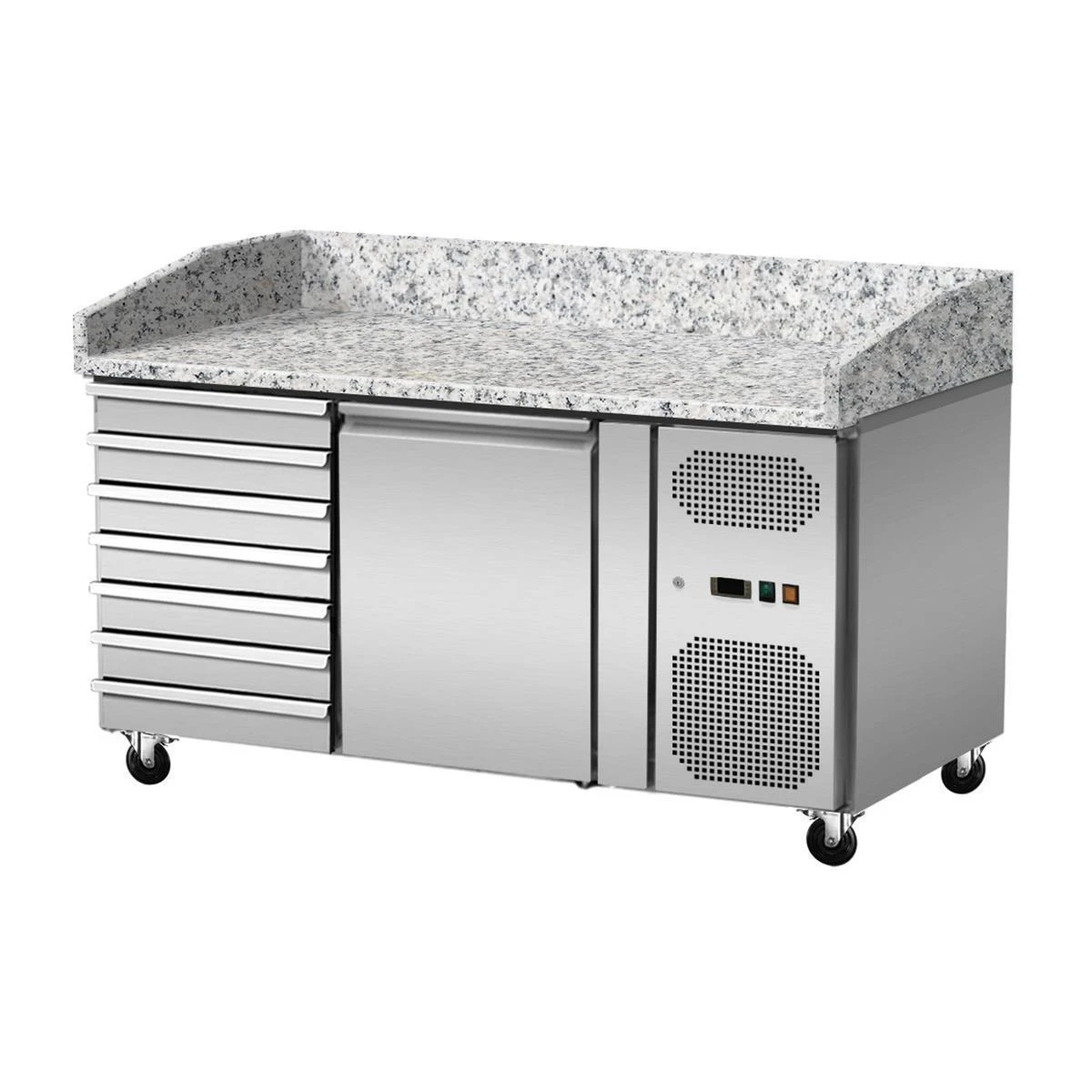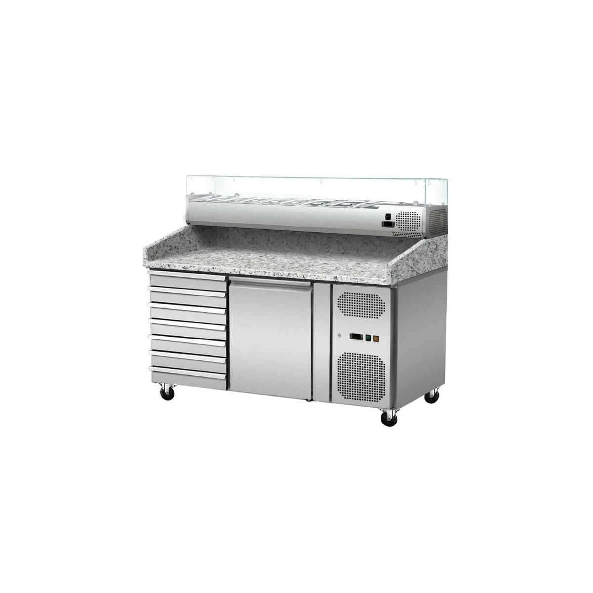 Pizza Kühltisch, Granit rosa-grau, 1 Tür, 7 ungek. Schubladen, 151 x 80 Kühlaufsatz GN1/3 mit Glas