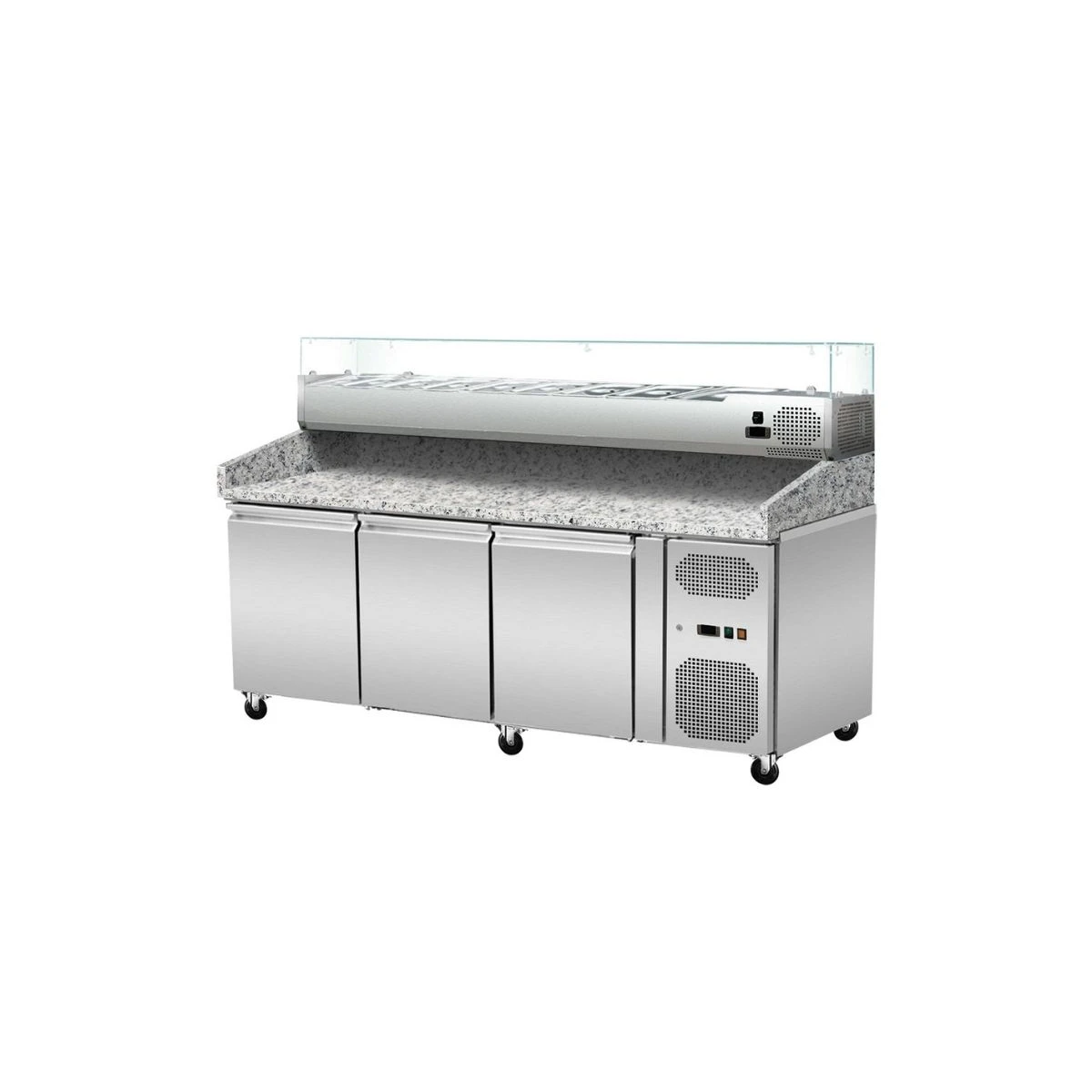 Pizza Kühltisch, Granit rosa-grau, 3 Türen, 203 x 80 Kühlaufsatz GN1/3 mit Glas